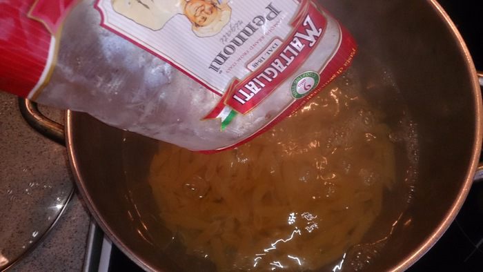 Засыпаем пасту и варим по времени, как указано на пачке (лучше на 1 — 2 минуты снять раньше).