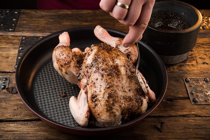 Этой смесью натереть курицу снаружи со всех сторон. Поставить в разогретую до 175°С духовку и выпекать 1 час.