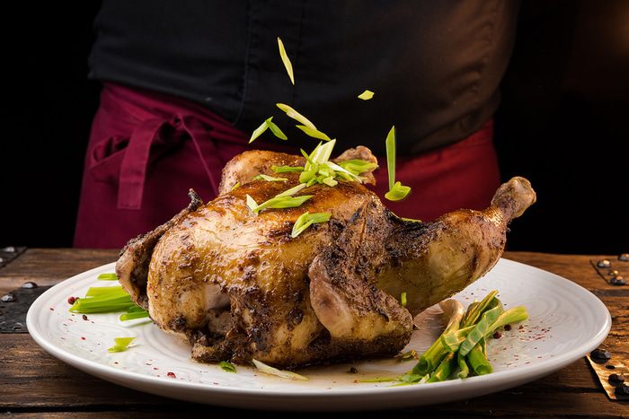 Готовую курицу смазать третьей порцией глазури, посыпать зеленым измельченным луком.