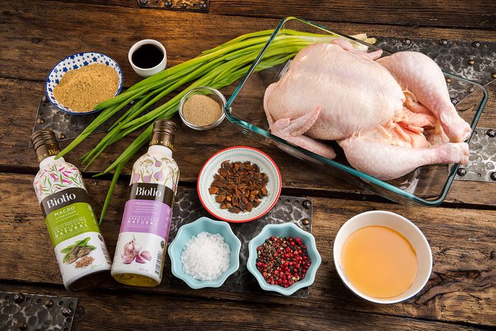 Курицу обмыть и протереть бумажными полотенцами. Смешать соль, перец, кардамон и бадьян в ступке, измельчить.