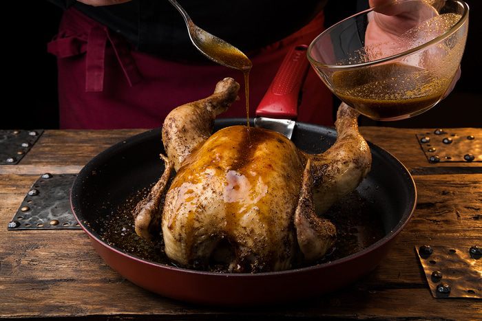 Смазываем курицу первой порцией глазури и ставим в духовку на 10 минут, увеличив температуру до 200°С. Вынимаем курицу и смазываем ее второй порцией глазури. Снова ставим на 10 минут в духовку при той же температуре.