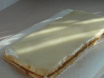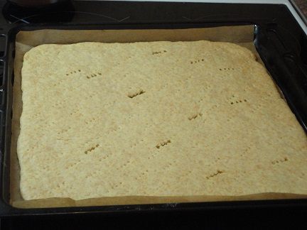 Мне хватило 15 минут при температуре 210°С. На фото может показаться слишком бледной выпечка, но в действительности она румяная. Готовый лист в теплом виде подравниваем с краев и разрезаем на две равные половины. Я из практики пришла к выводу, что разрезать и равнять песочное тесто лучше горячим, оно не так ломается.
