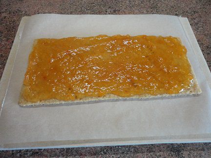 Коржи к этому времени уже достаточно остыли. На один корж намазываем ваш любимый джем, у меня — персиковый. Накрываем вторым и слегка прижимаем.