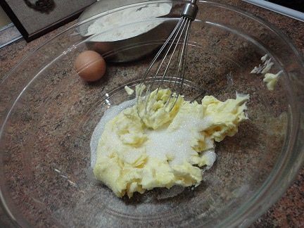 Включаем духовку для разогрева до 210°С и приступаем к замесу теста. Мягкое масло взбиваем с 1 столовой ложкой сахара, добавляем яйцо, еще немного взбиваем, затем добавляем сметану и перемешиваем.