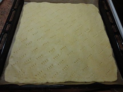 Отмеряем заранее лист пекарской бумаги по размеру формы и на нем на столе раскатываем тесто тонким слоем, не более 5 мм. Бумагу не смазываем и не посыпаем мукой, а вот тесто слегка присыпаем мукой для удобства при раскатывании. Но совсем немного. Накалываем тесто, чтобы оно не поднималось пузырями при выпечке.