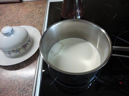 Пока коржи остывают, приготовим глазурь .Я отмерила сливки и сахар гранеными стаканами.