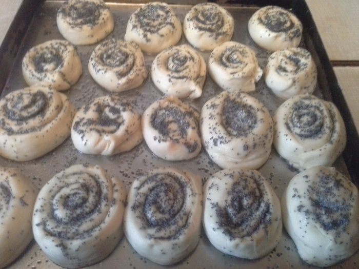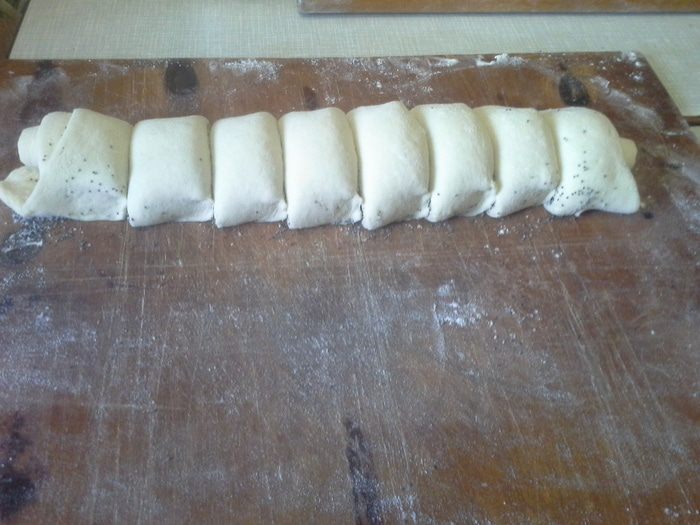 Свернуть пласт с маком в рулет и нарезать на одинаковые куски.