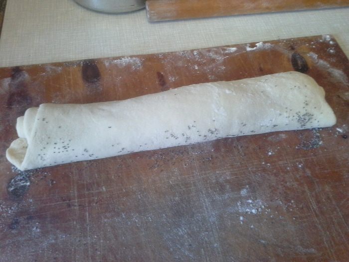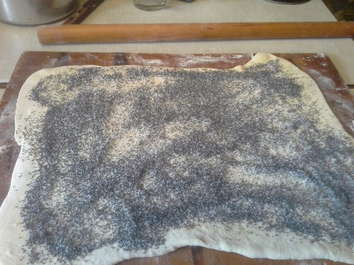 Тесто раскатать в пласт толщиной 4 — 5 мм и шириной 25 — 30 см. Поверхность пласта покрыть равномерно начинкой из мака.