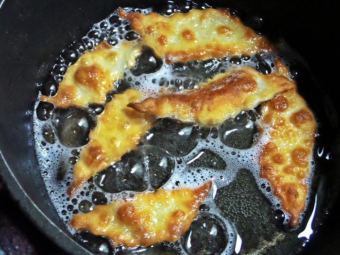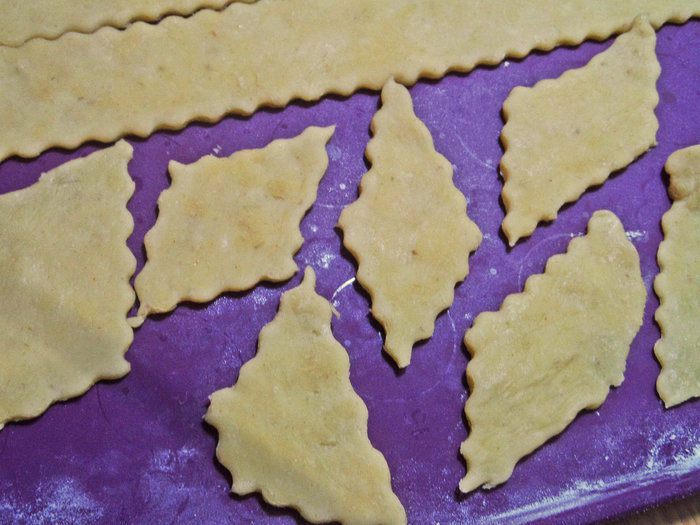 Как вы уже догадались, это печенье «хворост» по-итальянски. Готовят его на карнавальные недели (в феврале), продают повсеместно и называют «карнавальные плюшки». Название происходит от слова crosta — хрустящая корочка. Отличается от нашего аналога добавлением апельсинового или лимонного сока или цедры, можно с ароматным алкоголем. Если апельсины сладкие, сахар в тесто не обязателен, достаточно сверху сахарной пудры. Я использовала лимон, поэтому позволила ложечку сахара.