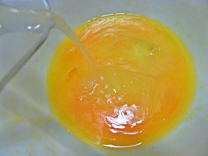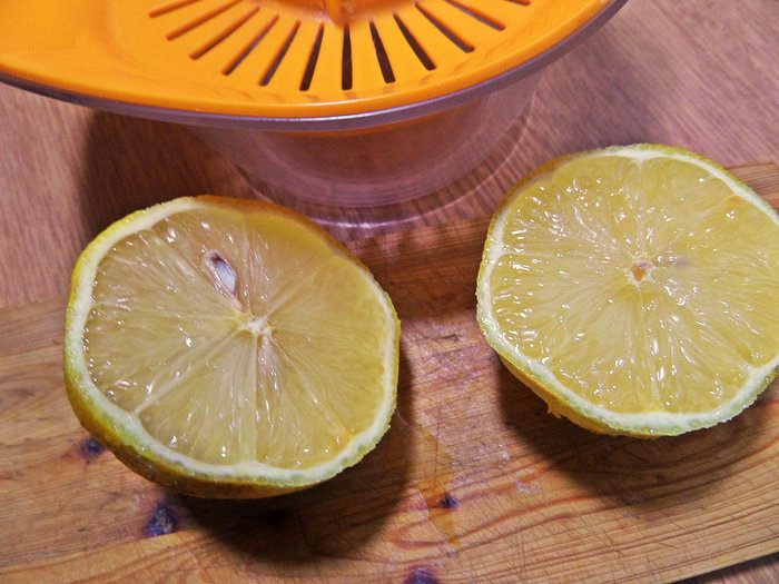 Выдавить сок из апельсина или, как я, из половинки лимона, с которого сняла цедру для кекса «Панеттоне»: http://www.edimdoma.ru/retsepty/89087-panettone