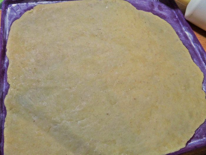 Раскатать тонко. Пласт получился почти во весь коврик размером 30 на 34 см.
