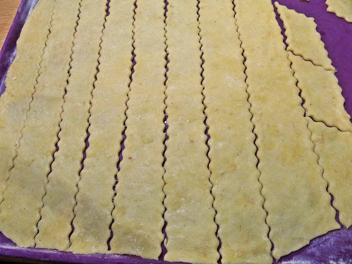 Нарезать на полоски, желательно ножом зигзаг.