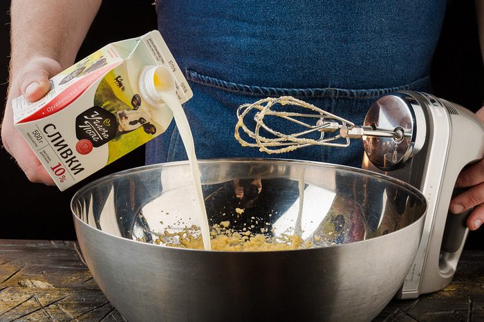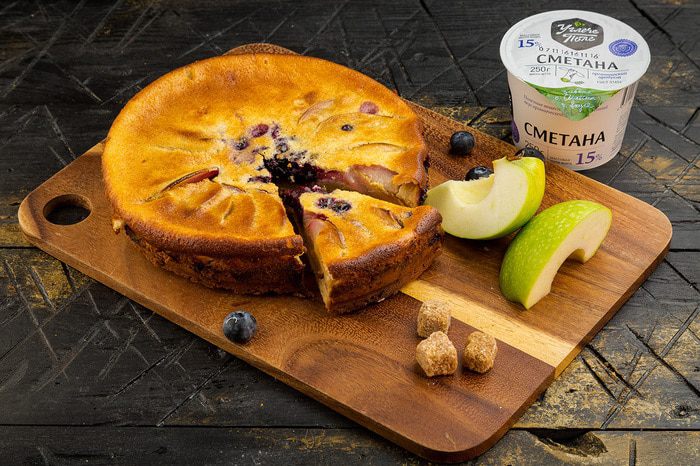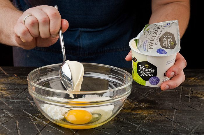 Приготовить сметанную заливку, соединив сметану ТМ «Углече Поле» с 1 яйцом, сахаром и кукурузным крахмалом.
