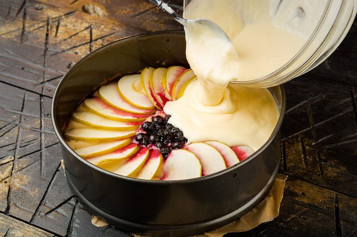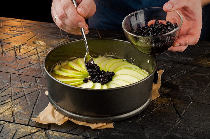 Предварительно форму выстелить пергаментом и промазать маслом. В форму выложить тесто, сверху на него — мелко нарезанные яблоки (сбрызнуть лимонным соком), далее — чернику.