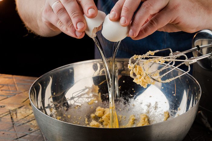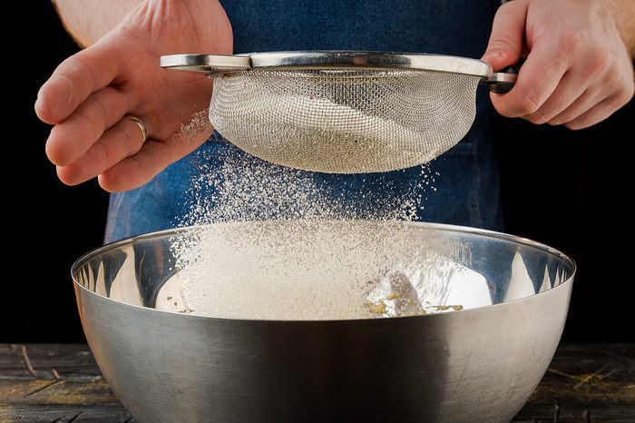 Муку просеять с разрыхлителем и хорошо перемешать всю массу.
