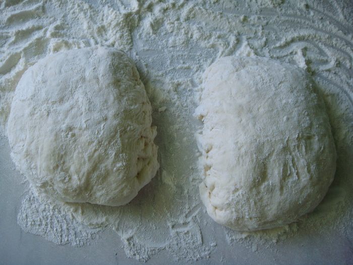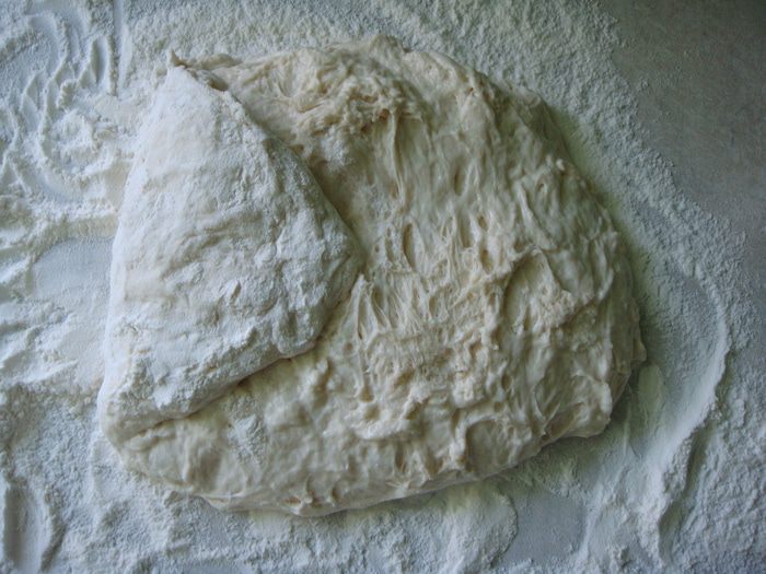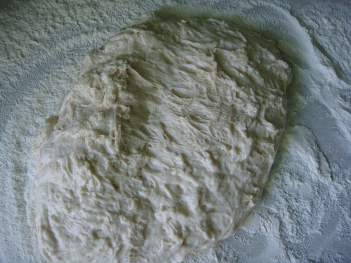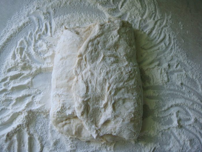 Стол сильно присыпать мукой и аккуратно выложить тесто.