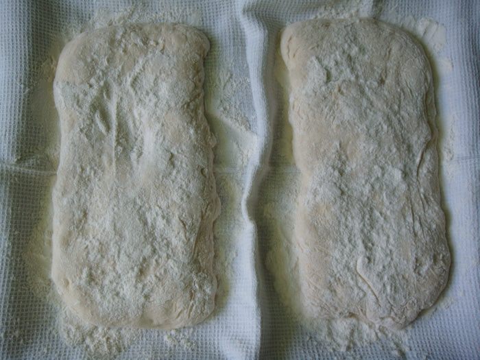 Духовку разогреть до 200°С вместе с противнем. Застелить его пергаментом и присыпать мукой. Аккуратно перенести чиабатту на противень, смахнуть излишки муки кисточкой. Выпекать хлебушек 30 минут, до румяной корочки.
