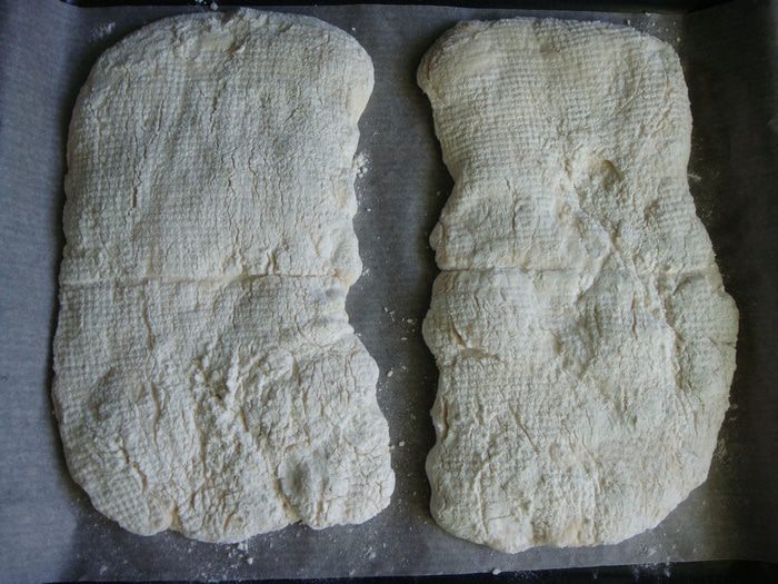 На противень расстелить вафельное полотенце и густо присыпать его мукой. Аккуратно растянуть тесто в прямоугольники и уложить на полотенце, сверху накрыть другим полотенцем и оставить при комнатной температуре на 1 час.