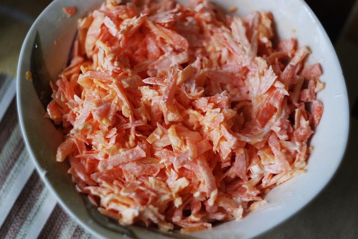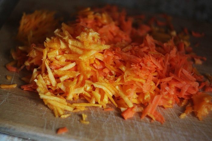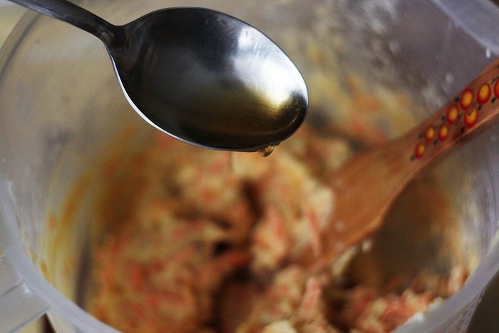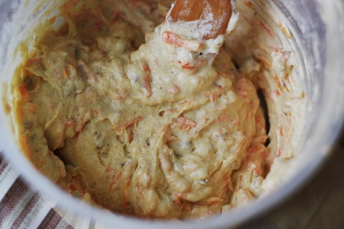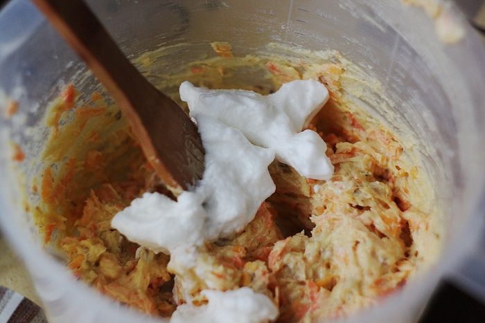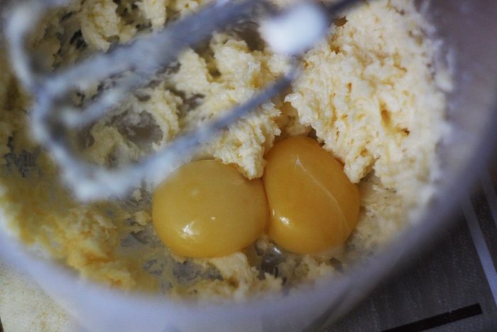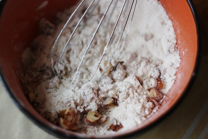 Просейте муку и смешайте ее с разрыхлителем и не слишком мелко рублеными орехами. Количество орехов можно увеличить — вплоть до 100 г, здесь уже дело вкуса. Также грецкие орехи можно заменить любыми другими, например, фундуком, но, на мой вкус, именно грецкие сюда подходят идеально.