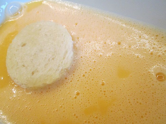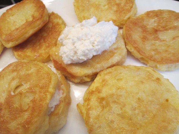 Взбиваем оставшиеся 3 яйца и белок и поочередно обмакиваем в смесь каждый кружок хлеба. Чтобы сделать равиоли из гренок, нужно осторожно раскатать скалкой смоченный в яйце кусочек хлеба. Положить на один фарш из рикотты и накрыть другим кусочком, прижать плотно руками края, равиоли готовы.