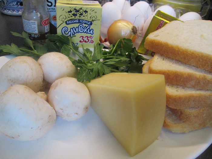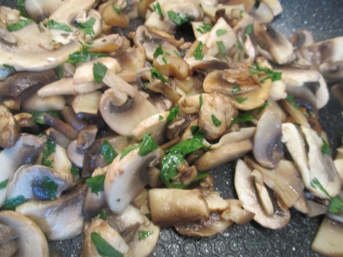 Разогреваем бульон, а тем временем нарезаем мелко лук, грибы режем ломтиками. Обжариваем грибы на оливковом масле и добавляем нарезанную мелко петрушку.