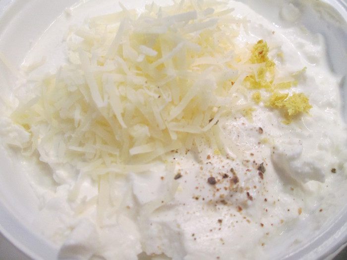Соединяем рикотту с цедрой и пармезаном. Добавляем соль, перец.