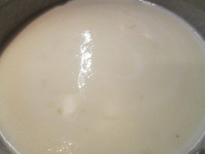 Вливаем бульон, тщательно размешиваем и снова ставим на огонь, готовим, постоянно помешивая, 4 минуты. Добавляем в бульон взбитый со сливками куриный желток, перемешиваем и готовим еще пару минут.