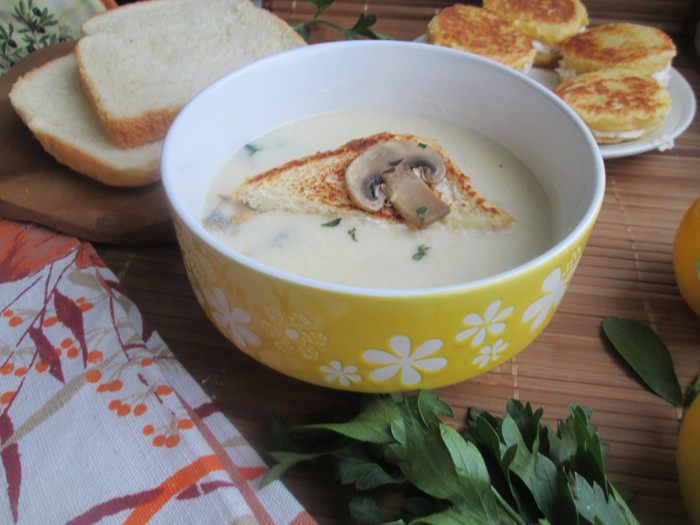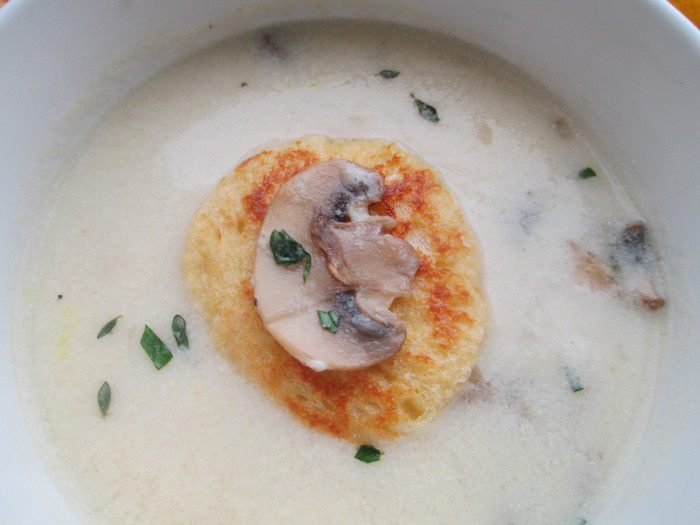 Теперь собираем наш крем-суп: укладываем на дно тарелки грибы, вливаем крем-суп, кладем равиоли. На них — немного грибов и посыпаем зеленью.
