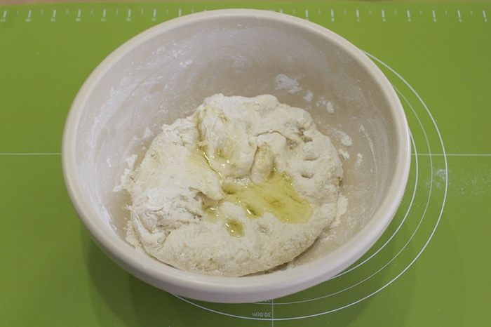 Затем начинайте месить тесто руками, собирая всю муку со стенок. Добавьте оливковое масло.
