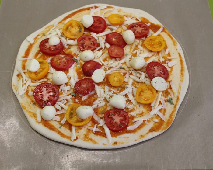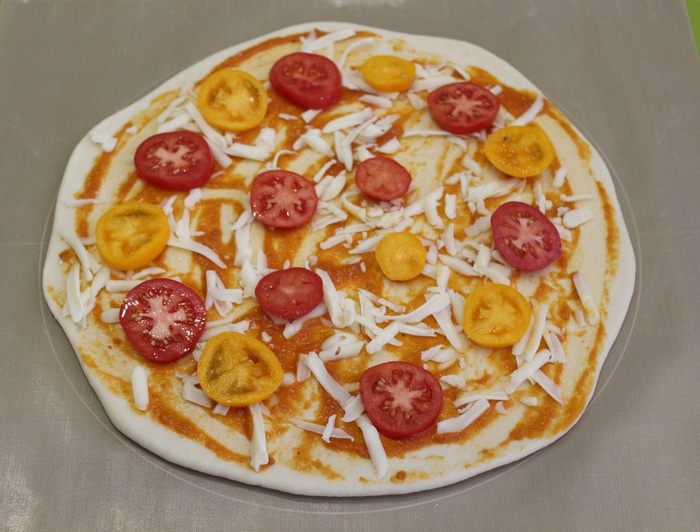 Выложите тесто на подпыленную мукой поверхность и раскатайте до толщины 2 — 3 мм, диаметром около 30 см. Затем тесто намазать томатным соусом, натереть сыр моцарелла, выложить дольки помидор.