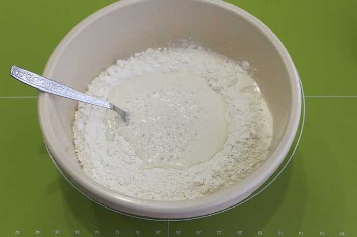 В центре сделайте углубление и влейте дрожжевую смесь. Перемешайте смесь вилочкой, постепенно вовлекая в процесс муку от центра к периферии.