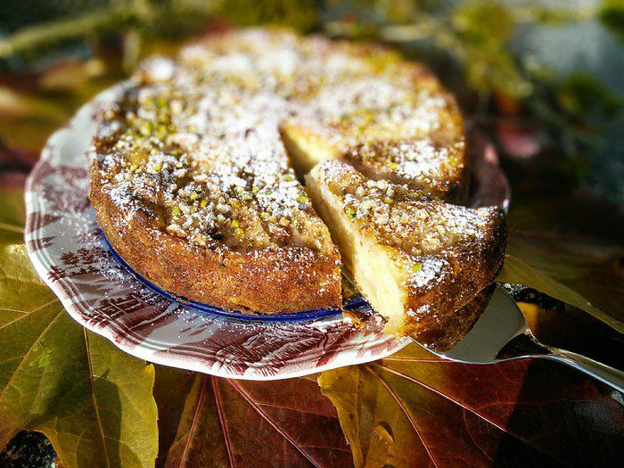 На этот раз это простой домашний пирог. Цитрусовый потому, что в нём лимонный сок, апельсиновая цедра и даже апельсиновый ликер! Все эти ароматы помогают груше «раскрыться» и зазвучать по-новому. Тесто среднее между песочным и кексовым и много-много сочной груши. А еще фисташки, миндаль, ваниль… Думаю, выпечка удалась:) Спешу сделать фото, пока на улице светит солнце!