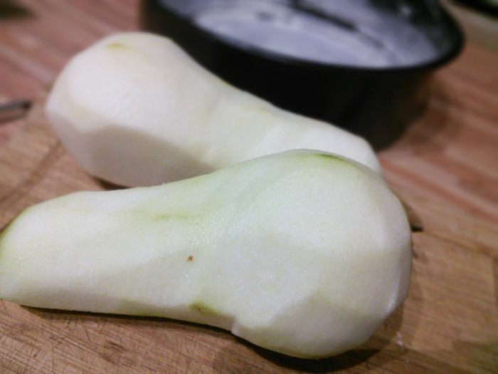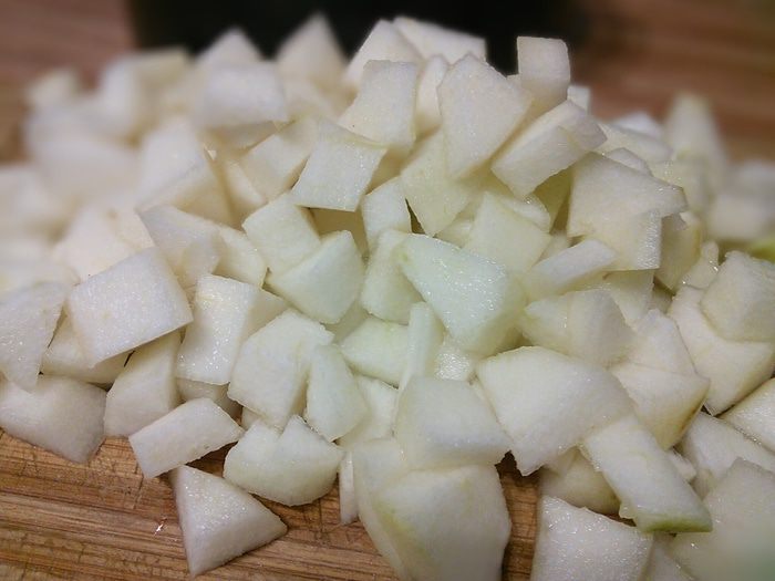 Груши очистить. Половину нарезать мелким кубиком. Разьемную форму (22 — 24 см в диаметре) смазать маслом и посыпать мукой или манкой.