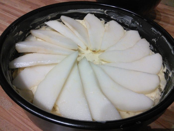 Во взбитое масло ввести муку, размешать лопаточкой и вмешать груши, порезанные кубиком. Тесто выложить в форму, разровнять, а сверху веером выложить грушевые пластины.