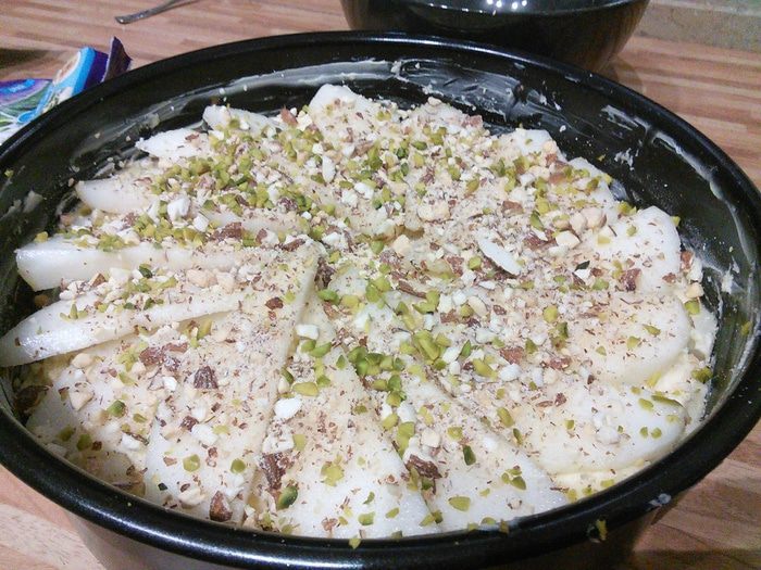 Вторую половину груш нарезать пластинами. Полить лимонным соком. У меня было 3 крупные груши, если у вас плоды средней величины, возьмите 4 шт.
