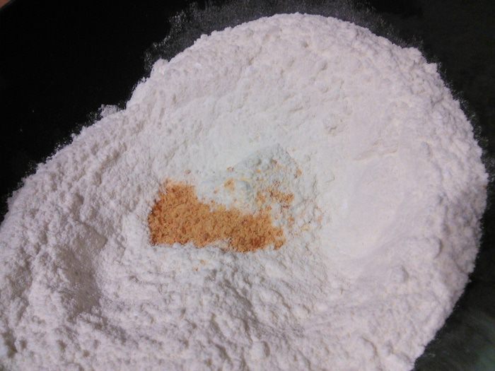 Муку смешать с разрыхлителем, щепоткой соли и добавить апельсиновую цедру, размешать.