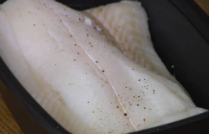 Филе палтуса вымыть и обсушить, затем посолить и поперчить со всех сторон.