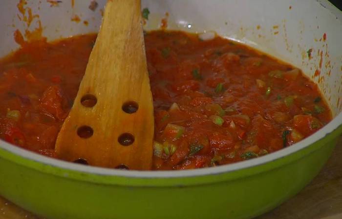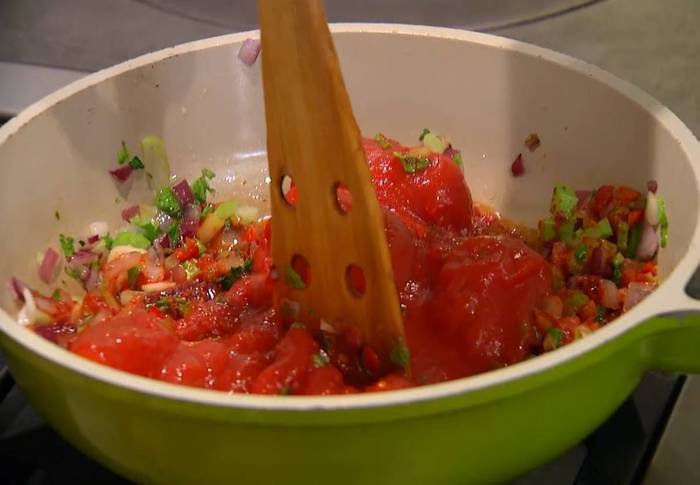 Перец чили мелко порубить и добавить к овощам, затем выложить в сковороду консервированные помидоры, измельчить их лопаткой, все посолить и прогреть на маленьком огне.