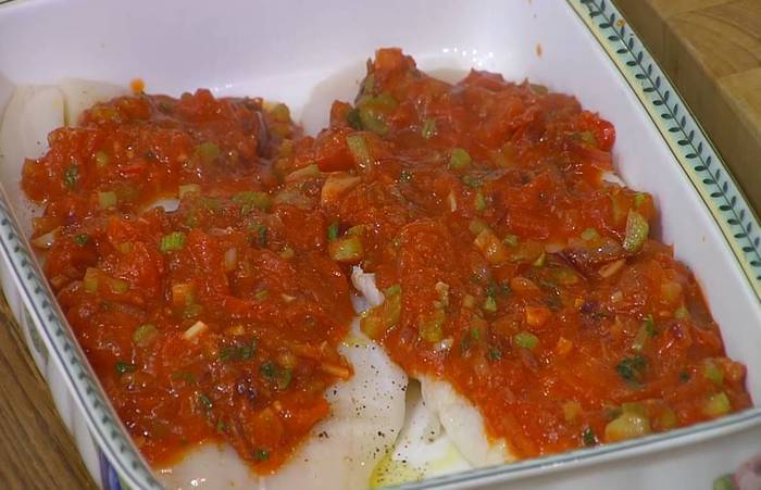 Жаропрочную форму слегка сбрызнуть оливковым маслом, выложить рыбу, сбрызнуть ее оставшимся маслом, сверху равномерно распределить овощной соус.