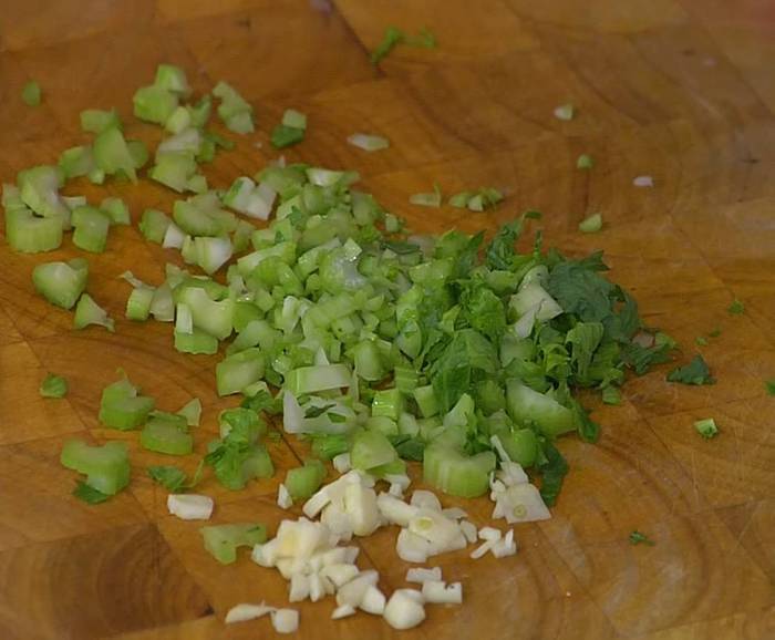Сельдерей вместе с листиками мелко порубить.