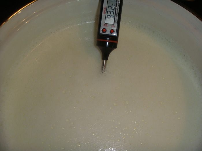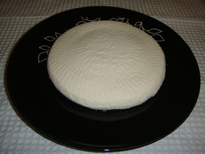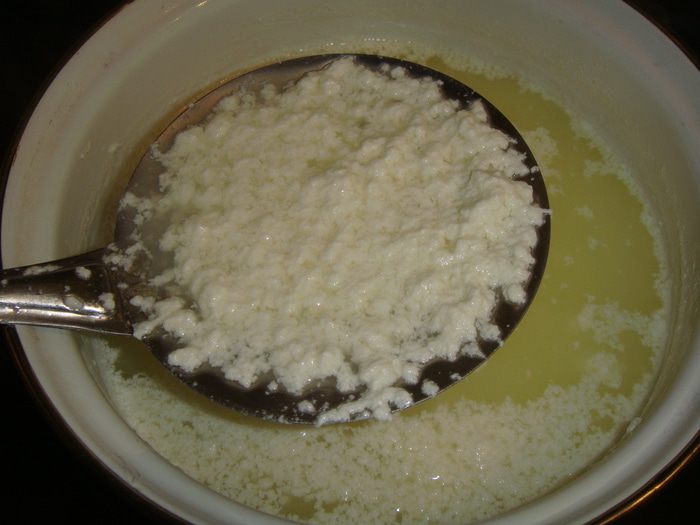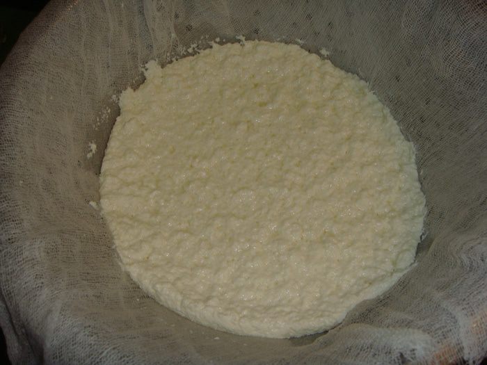 Дуршлаг застелить марлей и процедить массу. Время стекания сыворотки от 10 минут до 1 часа. Все зависит от ваших предпочтений, через 10 минут сыр будет более влажным, а через час — сухим. Я оставила на 40 минут, получился сыр средней влажности. Оставшуюся сыворотку можно использовать для приготовления выпечки, заменив молоко или воду.