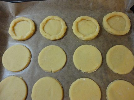 Включить духовку для разогрева до 200°С. Охлажденное тесто раскатать в пласт толщиной 5 мм и тонким стаканом вырезать 18 кружочков. Уложить их на противень, выстланный пекарской бумагой. Края кружочков смазать яичным белком, а из оставшегося теста сформовать тонкие колбаски и выложить в виде бордюрчиков по краям кружочков.