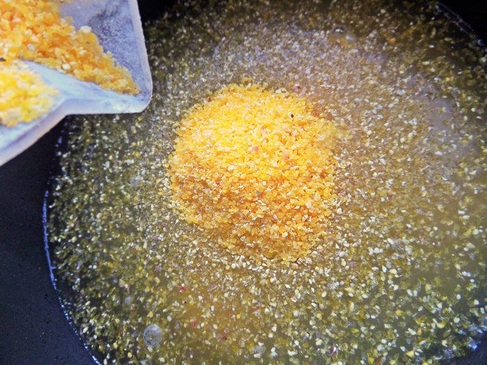 В горячую подсоленную воду (вначале 300 мл) всыпать кукурузную крупу.