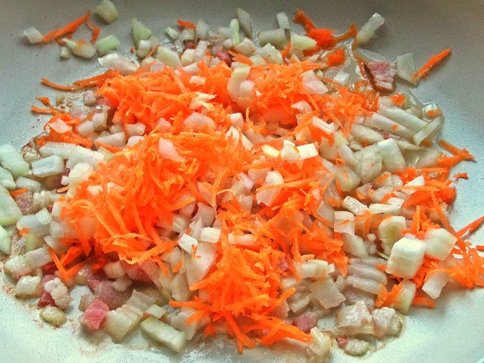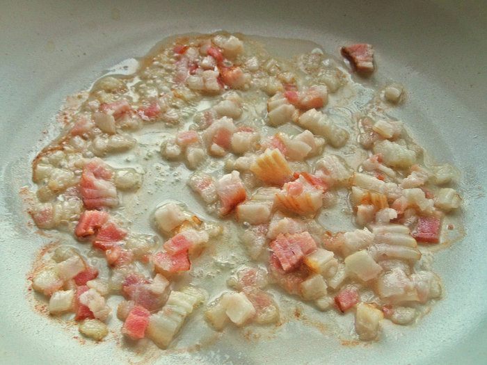 Бекон настрогать мелкими кубиками. Удобно это делать, когда бекон замороженный.