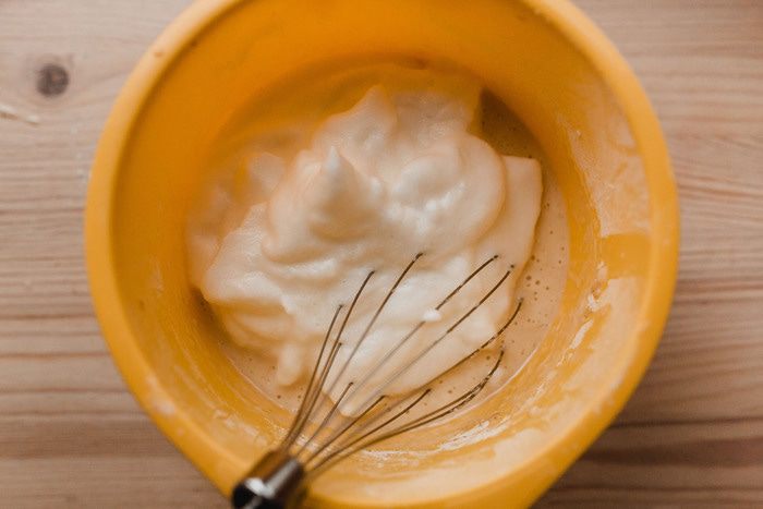 В отдельной емкости взбить белок до крепкой пены и аккуратно подмешать в основное тесто.