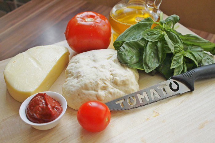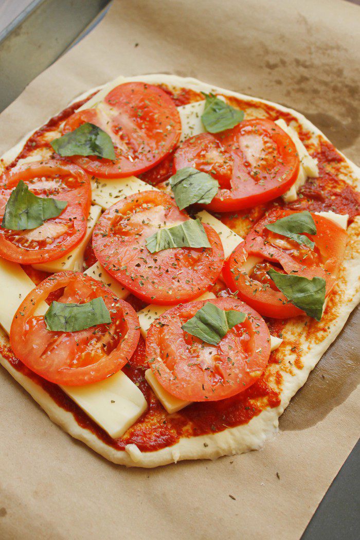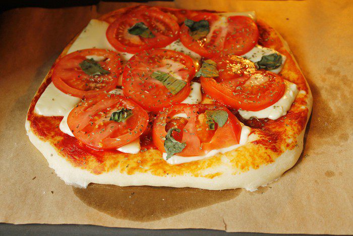 Раскатать тесто, смазать томатной пастой, уложить моцареллу кусочками, сверху — помидоры кружочками. Приправить слегка солью и перцем, свежим базиликом.