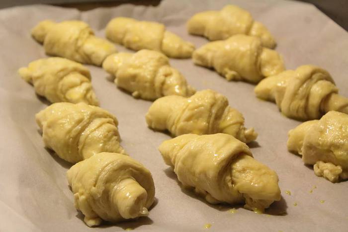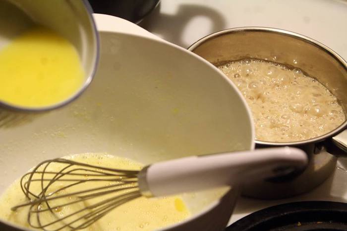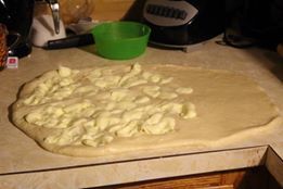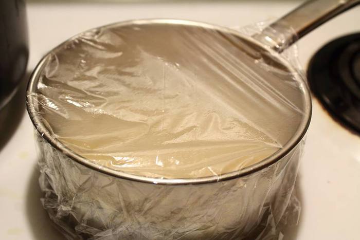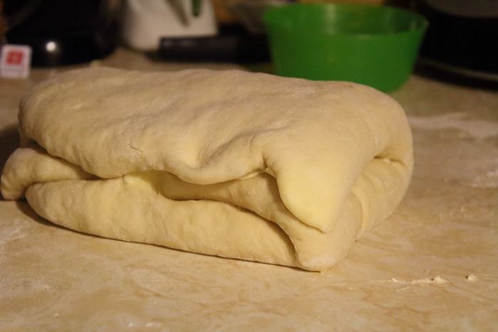 250 г масла поставить для прогрева до комнатной температуры, а тесто поместить в емкость, смазанную растительным маслом, накрыть пленкой и поставить на 1 — 1,5 часа на расстойку в теплое место.