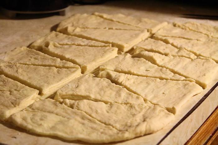 Вмешиваем просеянную муку и замешиваем тесто. Эластичное и не прилипающее к рукам. Объем муки я указала минимальный — нужно смотреть в процессе. Я на последних этапах смазываю ладони растительным маслом, так тесто лучше вымешивается, не пристает к рукам, не забивается мукой.