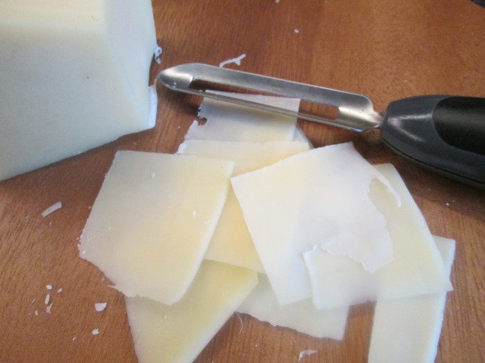 Овощным ножом нарезаем тонкие пластины пармезана.