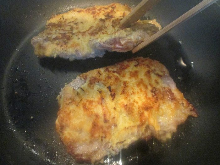 Обмакиваем отбивные сначала в яйцо, затем в сухари. Лишние сухари стряхнуть или по желанию, повторить оба этапа, если вы любите много панировки. Обжариваем отбивные на оливковом масле с обеих сторон до румяной корочки.